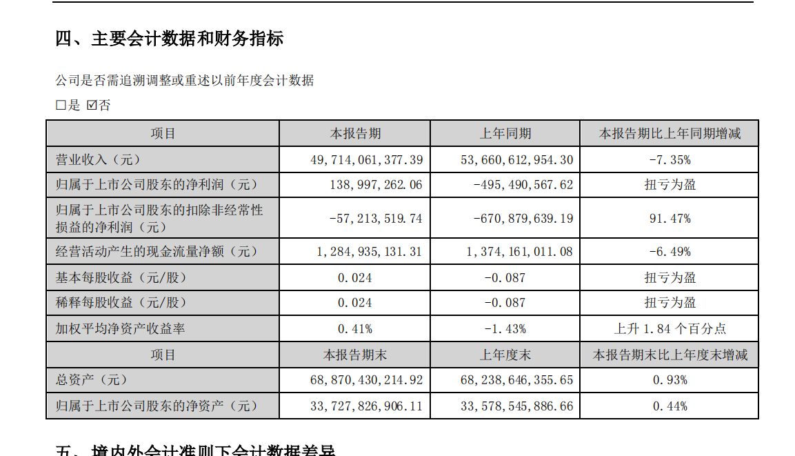 太鋼不銹(000825)8月30日晚間披露半年報(bào),公司上半年實(shí)現(xiàn)營業(yè)收入497.14億元,同比下降7.35%;凈利潤1.39億元,上年同期虧損4.95億元;基本每股收益0.024元。